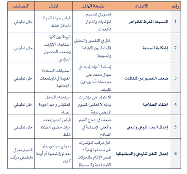 1. التبسيط المفرط للظواهر: يرى النقاد أن اختزال الظواهر الإنسانية المعقدة في متغيرات قابلة للقياس يؤدي إلى إغفال أبعاد جوهرية، مثل القيم الثقافية أو الرمزية (Denzin & Lincoln, 2011)
