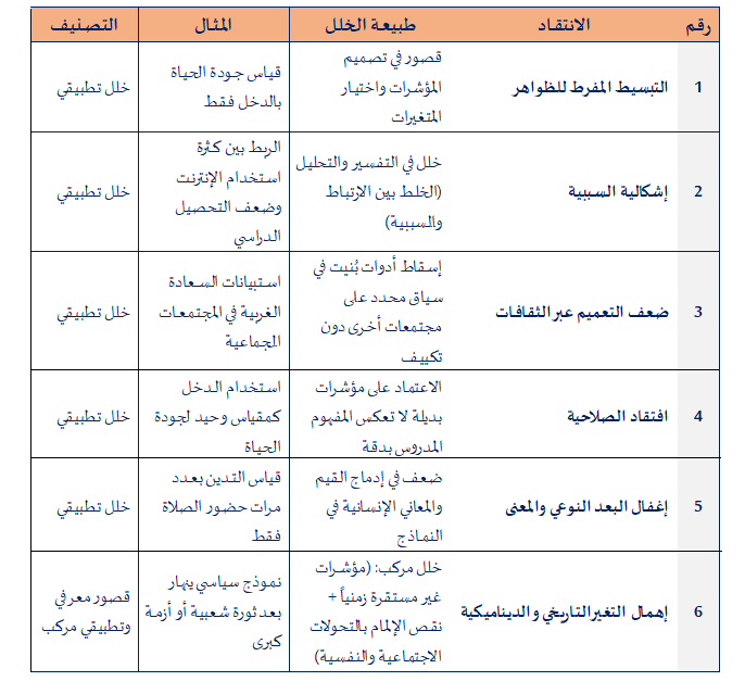 6. إهمال التغير التاريخي والديناميكية: غالباً ما تكون النماذج الكمية ساكنة (Static) ولا تعكس التحولات الديناميكية السريعة التي تطرأ على المجتمعات (Abbott, 2001).